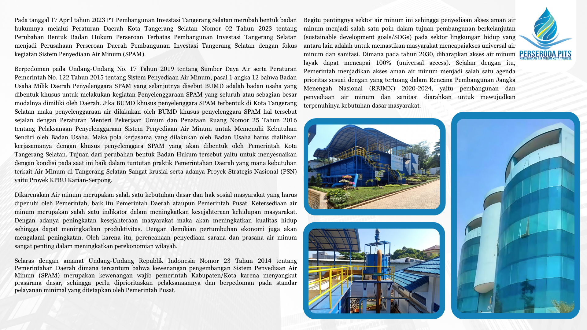 Pada tanggal 17 April tahun 2023 PT Pembangunan Investasi Tangerang Selatan merubah bentuk badan hukumnya melalui Peraturan Daerah Kota Tangerang Selatan Nomor 02 Tahun 2023 tentang Perubahan Bentuk Badan Hukum Perseroan Terbatas Pembangunan Investasi Tangerang Selatan menjadi Perusahaan Perseroan Daerah Pembangunan Investasi Tangerang Selatan dengan fokus kegiatan Sistem Penyediaan Air Minum (SPAM).