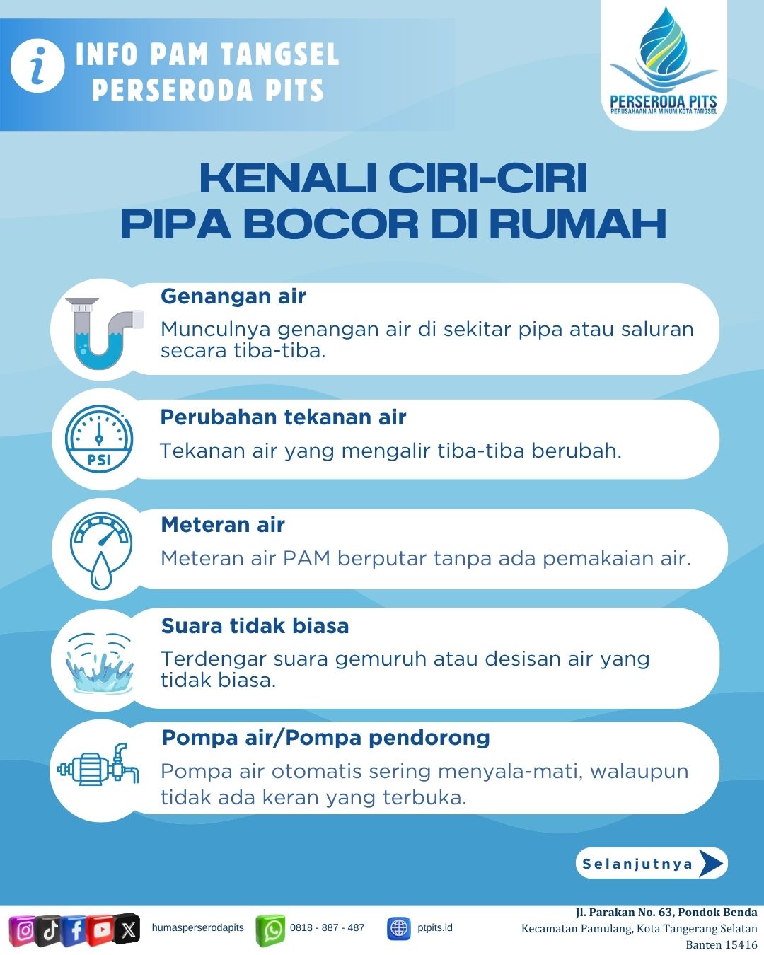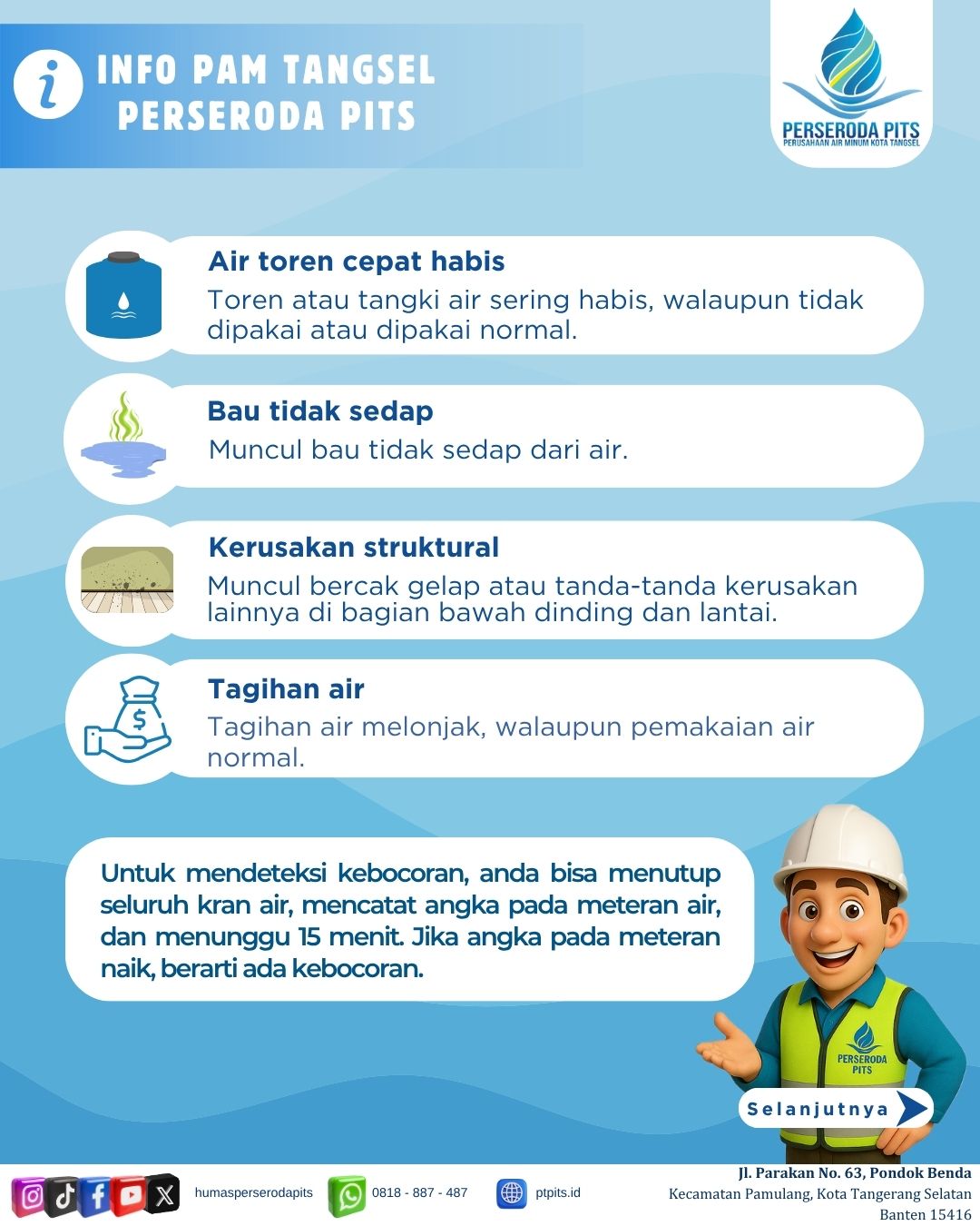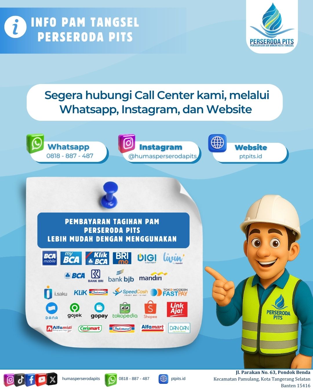 Pengumuman kepada seluruh pelanggan Perseroda PITS. Untuk menghindari denda keterlambatan, mohon melakukan pembayaran tagihan air pada tanggal 1–20 setiap bulannya